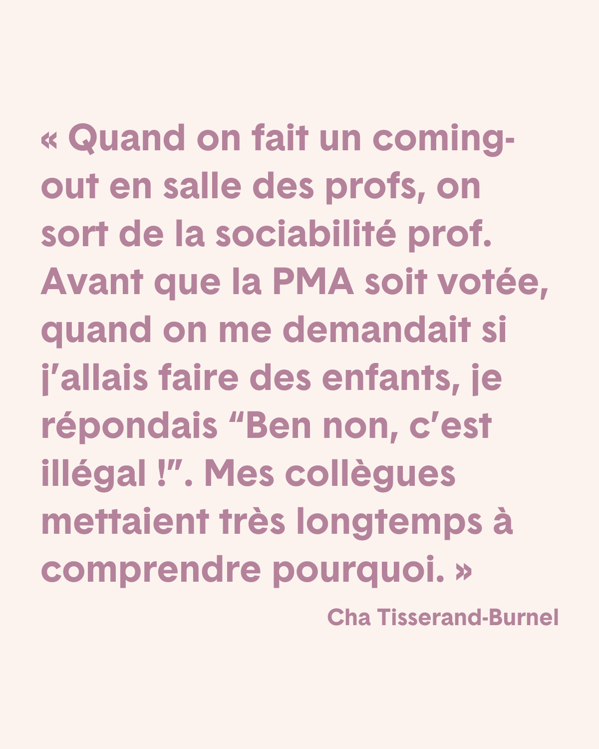 Cha Tisserand-Burnel : En fait, les étudiants et leurs profs, c'est deux faces d'une même pièce. Quand on fait un coming-out dans une salle des profs, on sort de la sociabilité prof. Parce qu'on est plus hétéro, on peut plus partager de belles histoires de rencontre hétéro de mon chéri, de ma chérie, et l'appartement dans le 11ᵉ, et puis et les enfants et le chien. En réalité, si, on peut tout à fait avoir ça maintenant. Avant que la PMA ne soit otée, quand on me demandait si j’allais faire des enfants, je répondais toujours “Bah non, c'est illégal”. Et mes collègues mettaient très longtemps à comprendre pourquoi.